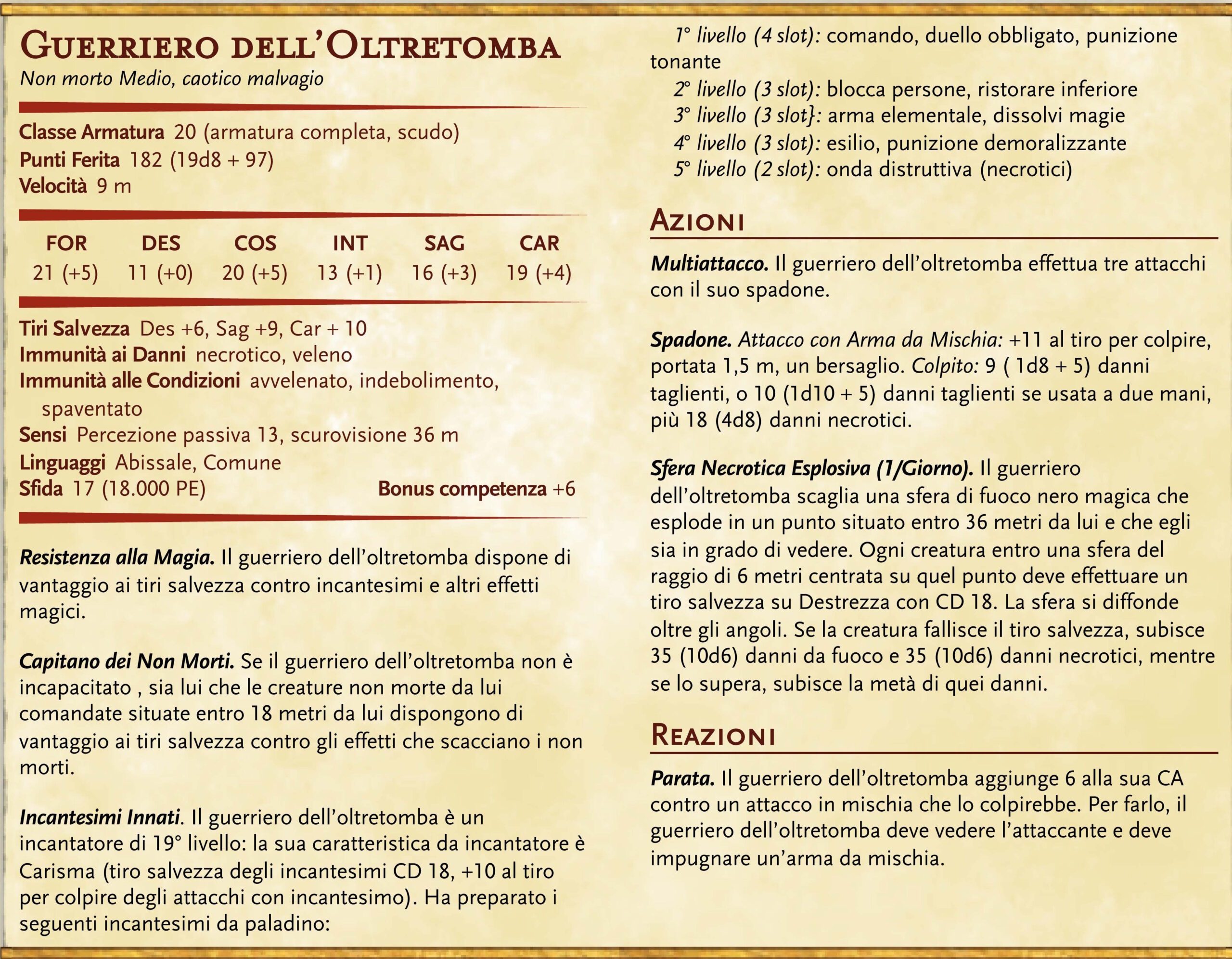 È la figura che solitamente dialoga con il padrone vivente di queste creature non morte e colui che ne fa rispettare la volontà. Sono ottime guardie del corpo e hanno una innata capacità di lanciare incantesimi che gli vengono insegnati direttamente da chi lo ha evocato o creato. Per questo motivo gli incantesimi dei guerrieri dell’oltretomba possono variare considerevolmente da guerriero a guerriero; uno potrebbe essere specializzato in incantesimi di danno perche il suo padrone lo ha messo a capo di un’ armata, un altro guerriero potrebbe essere specializzato più sulle magie di controllo se il suo compito è quello di presidiare e difendere un’area, un altro ancora potrebbe essere specializzato nella magia che controlla l’acqua se l’area da difendere è nel mare ecc ecc.