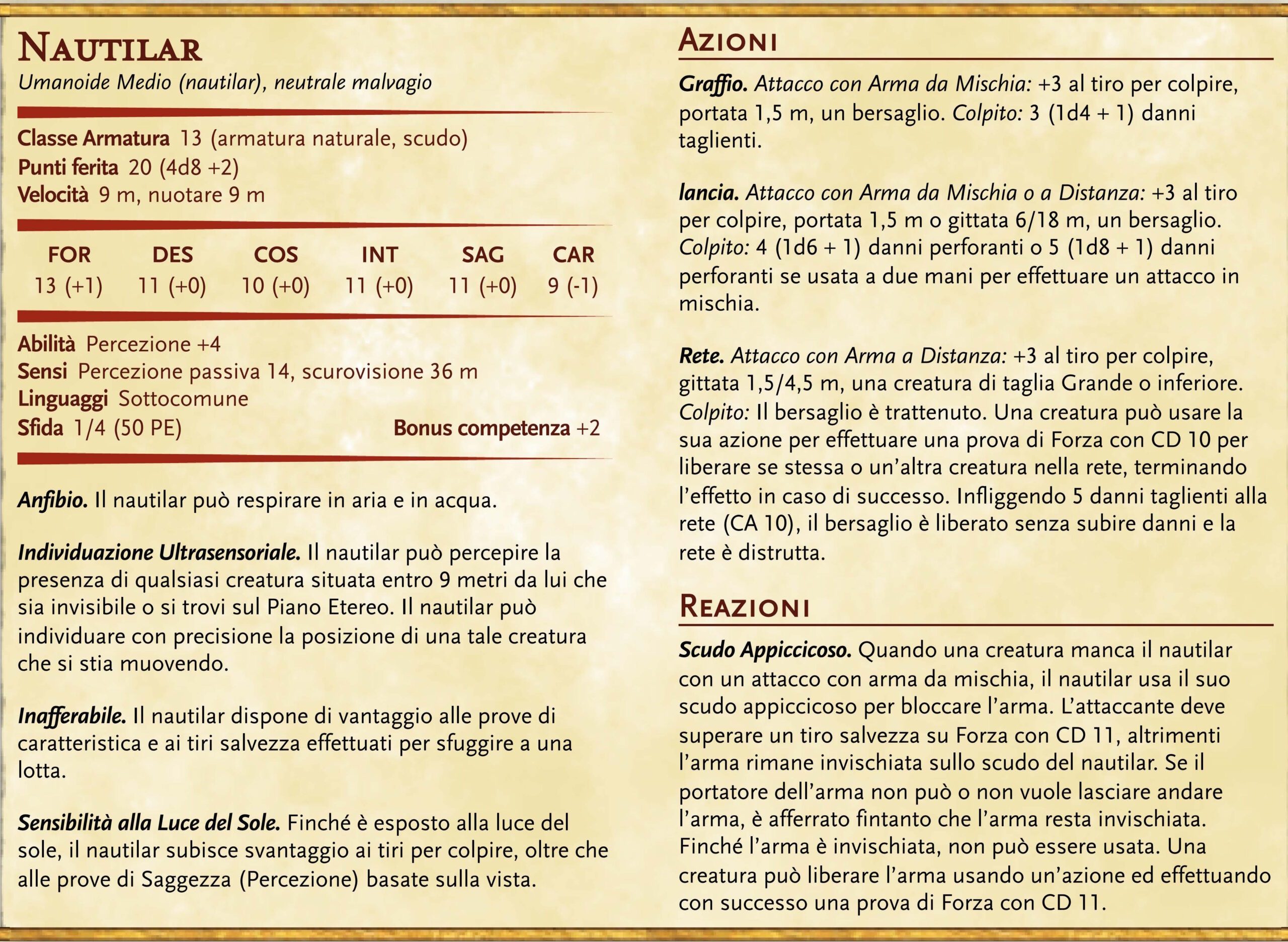 I nautilar sono dei pesci in forma umanoide molto sviluppati, hanno infatti una discreta intelligenza ma applicata in modo del tutto sbagliato. Sono creature semplici e credulone ma il loro aspetto e i loro modi li hanno resi dei nemici da scacciare per molte popolazioni umane. Questo clima di odio e guerra verso i nautilar li ha spinti a rifugiarsi sotto terra o nelle profondità del mare. Ad oggi queste creature non tollerano più la luce del sole.